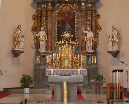 Der Hochaltar mit seinem vier Säulen zeigt das Maria-Himmelfahrtsgemälde von Martin Bolster. Der linke Seitenaltar ist der Muttergottesaltar. Der rechte Seitenaltar stellt die vierzehn Nothelfer dar. Vergoldungen und rotgoldene Marmorierungen zieren die Altäre.
